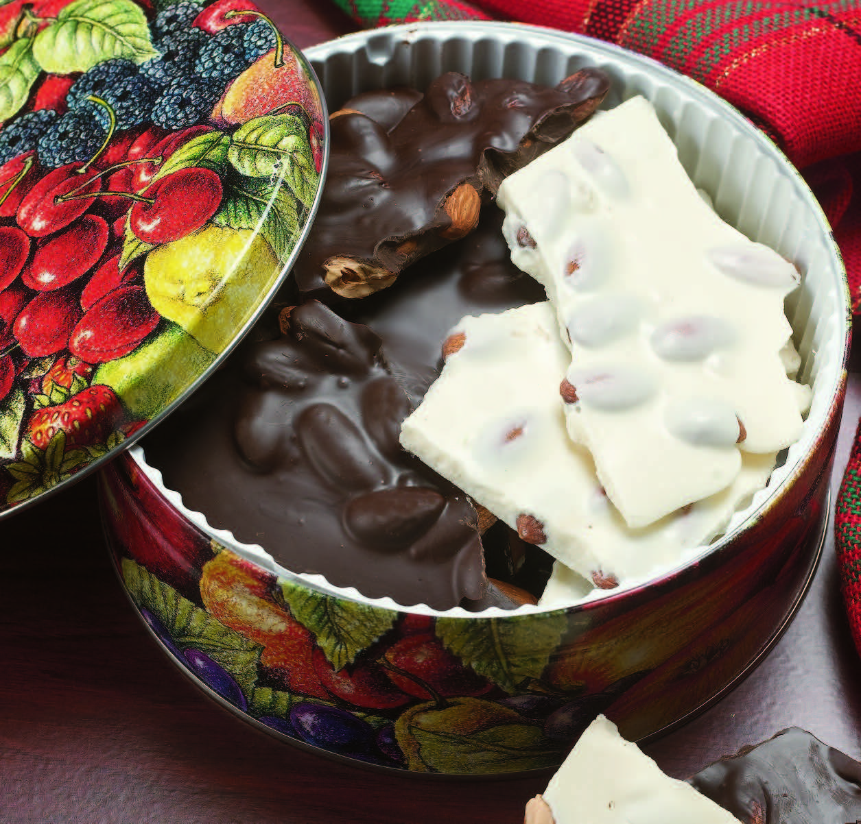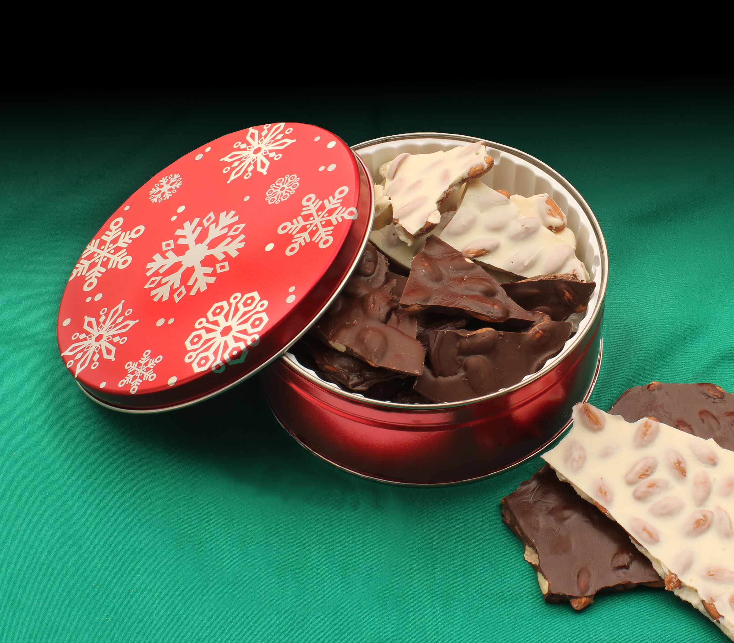 Dark chocolate and creamy White Satin Almond Bark packed in tins.